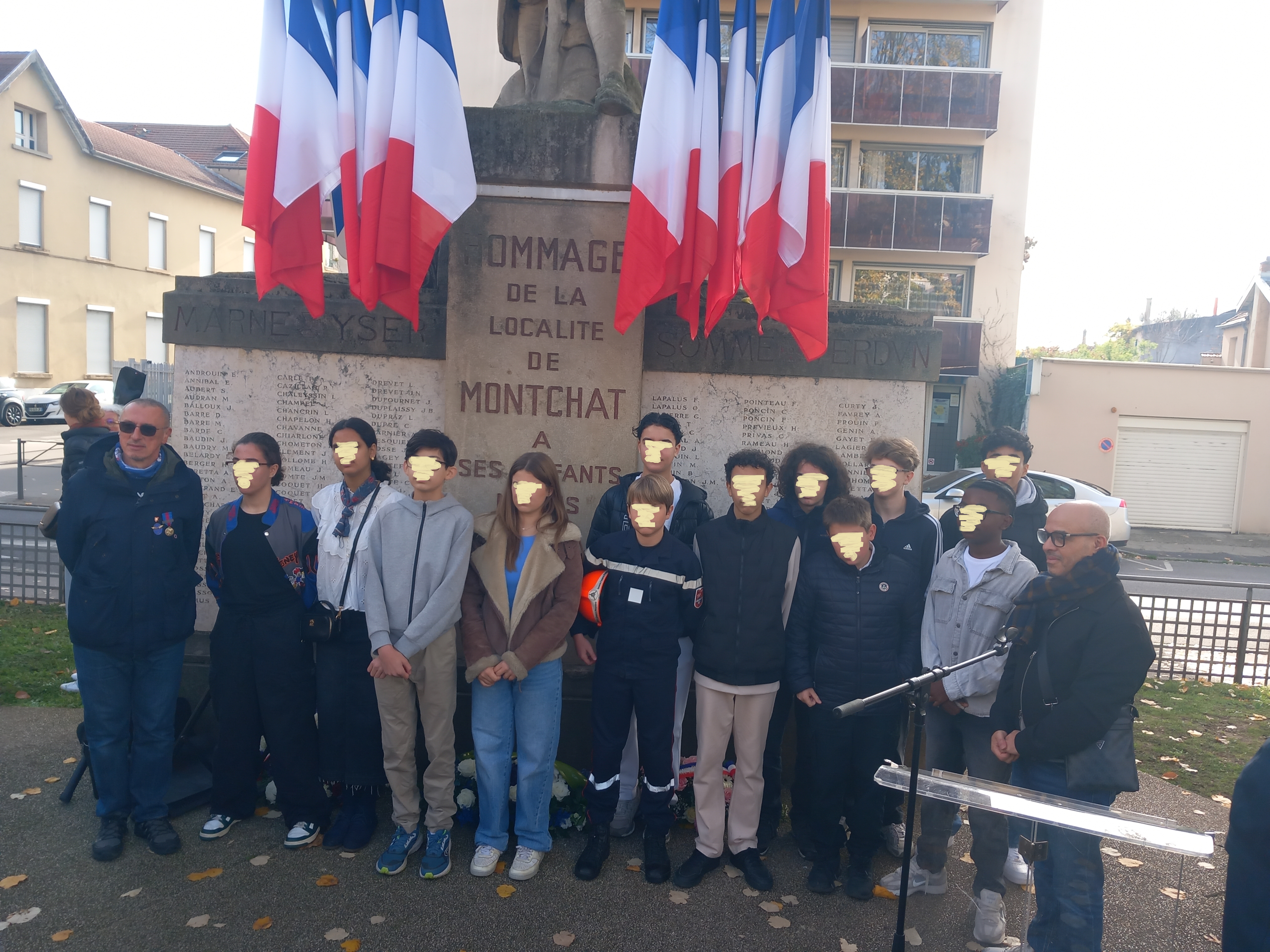 Ce mardi 11 novembre 2025, les élèves du collège Dargent, qui suivent la formation dispensée entre autres par Monsieur MILKO au BIA (Brevet d’Initiation à l’Aéronautique), ont participé à Montchat à la commémoration du 11 novembre 1918. Deux d’entre eux ont lu un discours, tandis qu’un autre était porte-drapeau. Ils ont entendu les discours des élus et représentants des anciens combattants. Des jeunes sapeurs-pompiers étaient également présents à la cérémonie, parmi lesquels un élève du collège. Cette cérémonie a été l’occasion de montrer l’engagement de nos élèves.